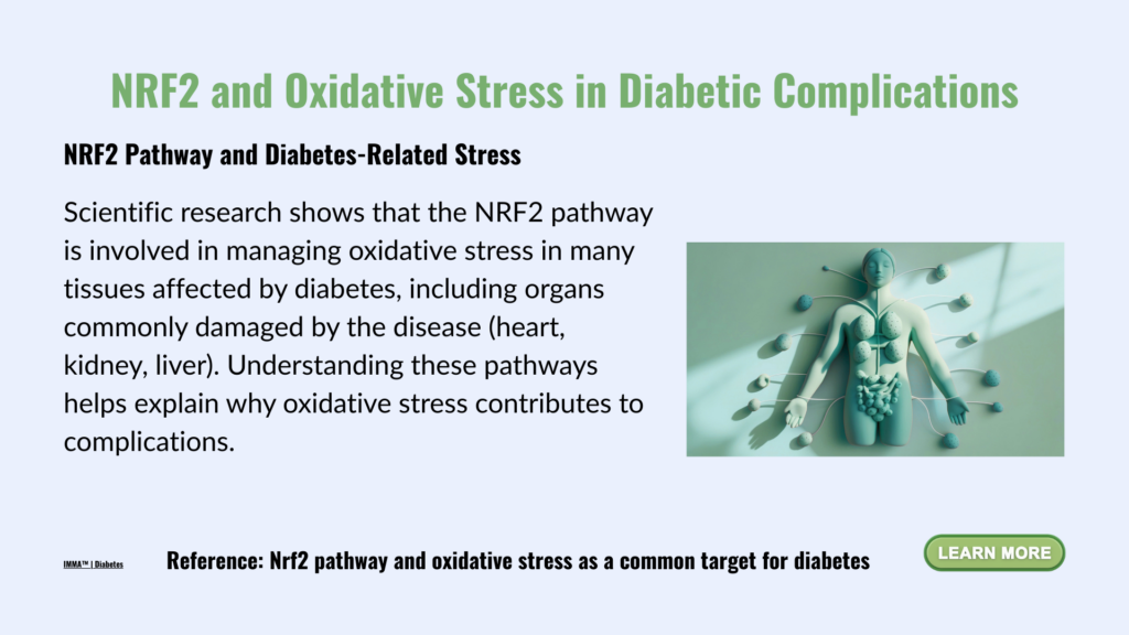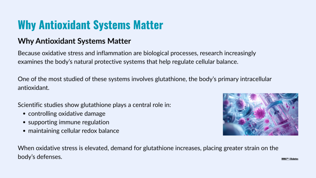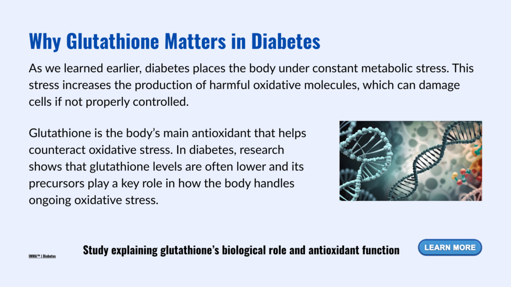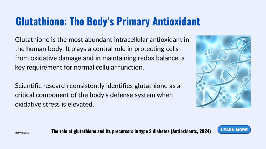 This glutathione deficiency contributes to insulin resistance, pancreatic beta-cell dysfunction, vascular inflammation, and nervous system damage — mechanisms closely associated with long-term diabetic complications.