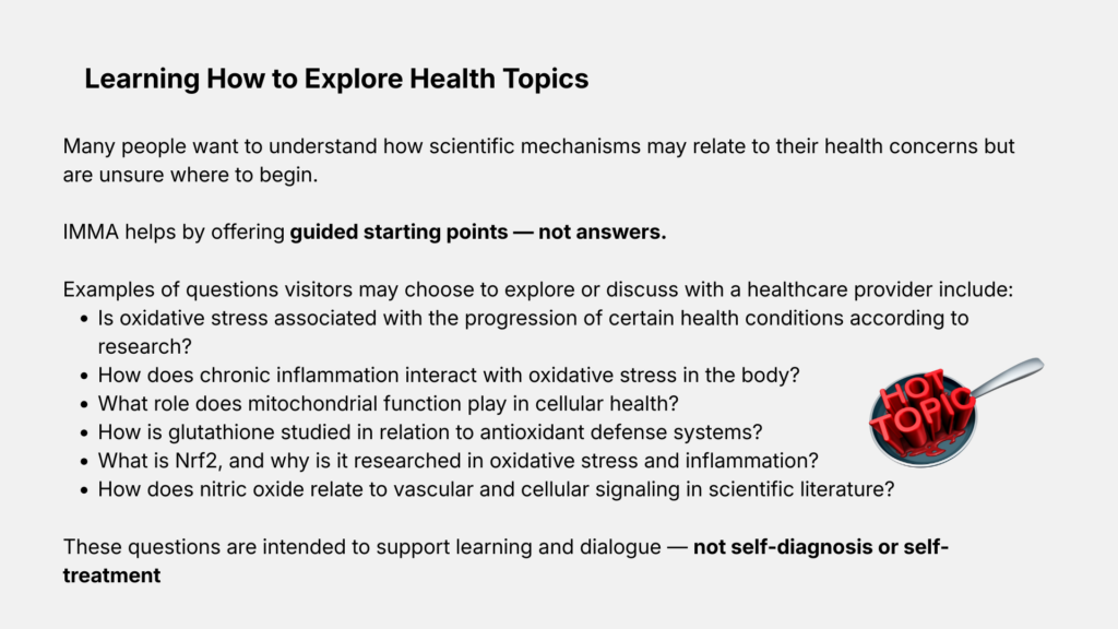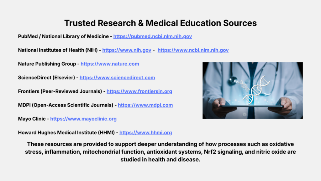 These resources are provided to support deeper understanding of how processes such as oxidative stress, inflammation, mitochondrial function, antioxidant systems, Nrf2 signaling, and nitric oxide are studied in health and disease.